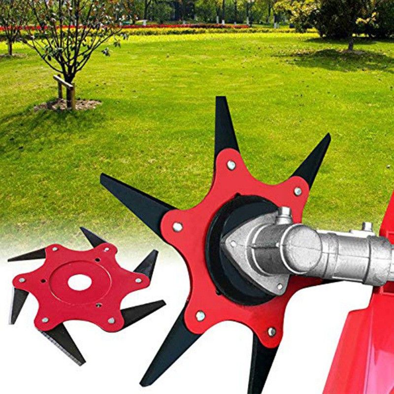 A variety of cutting heads and blades are available. This blade provides a high mowing capacity in difficult conditions, such as matted and dry grass, ferns and reeds. Each blade has a specific area in which it excels. Ideal for use in overgrown areas, this brush cutter is comprised of three blades that form an effective cutting surface to get the job done. This 6 blade weed whacker attachment cuts it like butter.